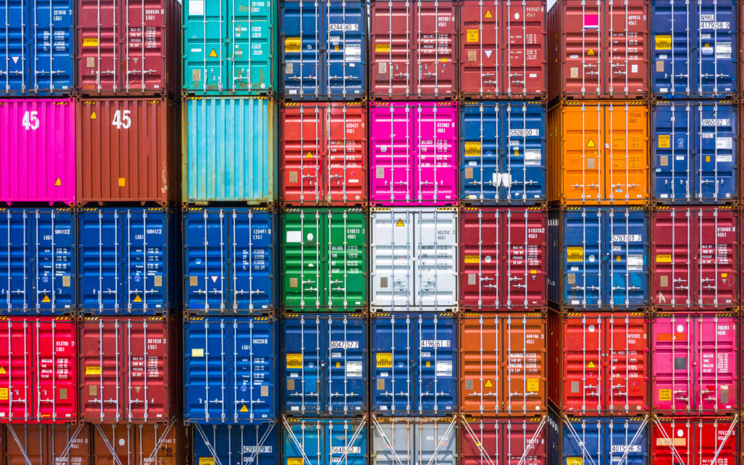 Freight Shipping Containers At The Docks, Stack Of Containers In