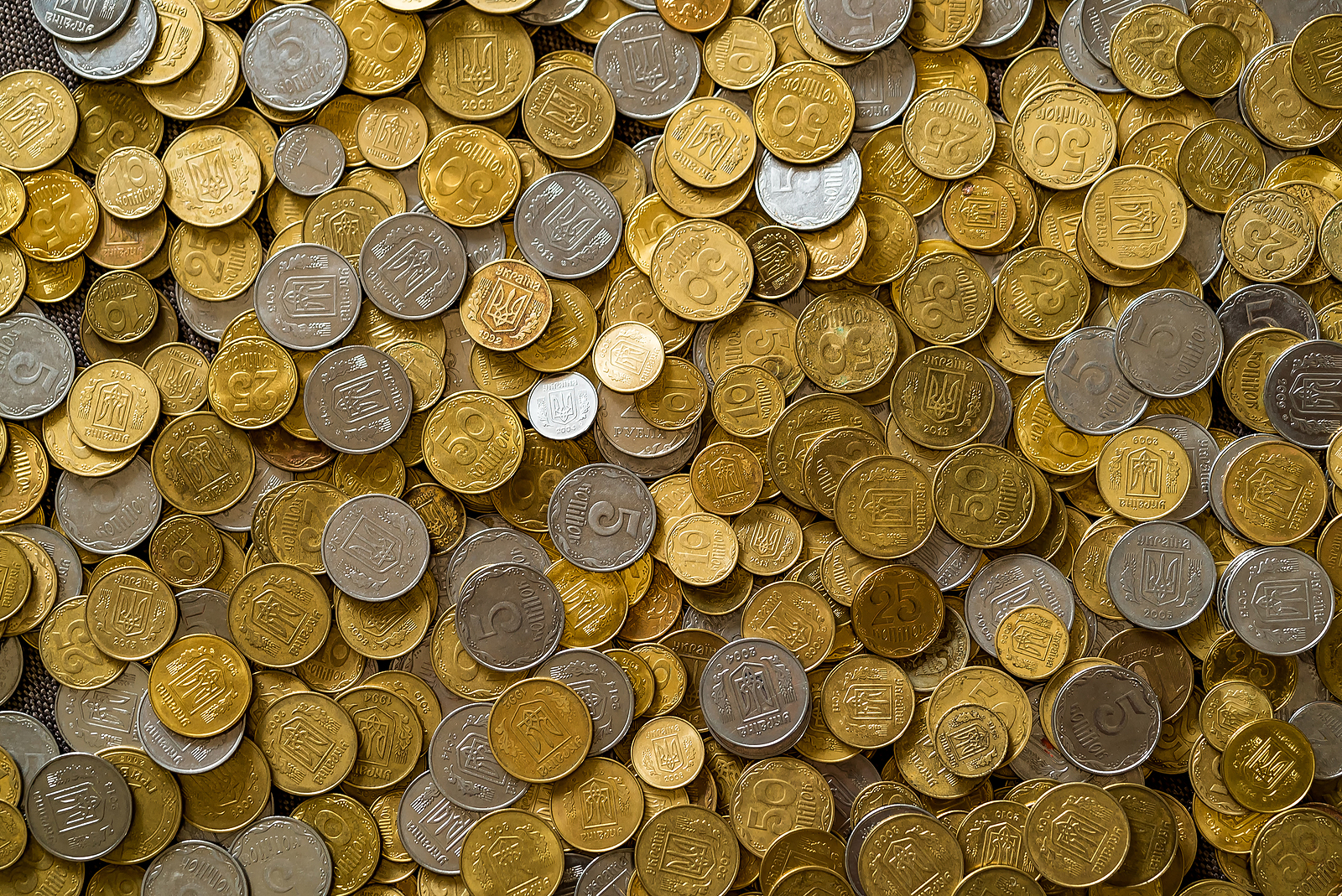 Plenty Of Golden And Silver Coins. Copper Coins, Quarters, Nicke